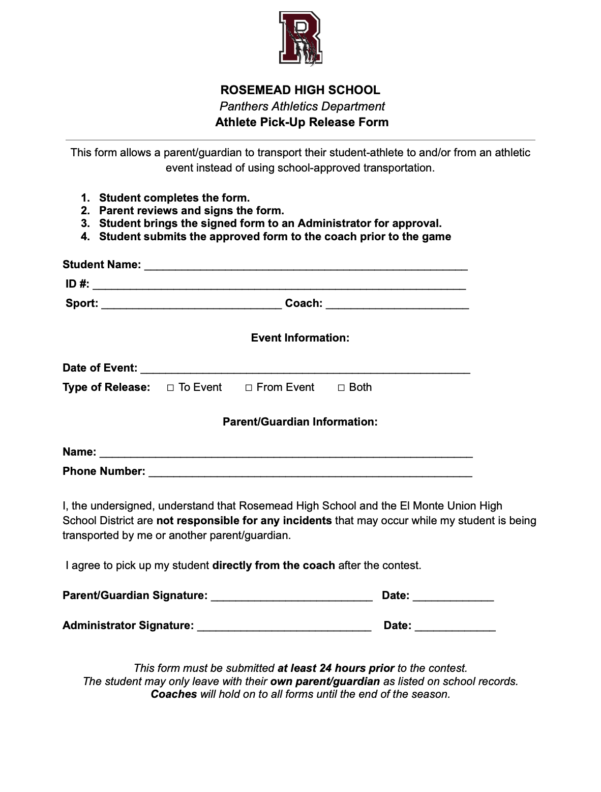 This form allows a parent/guardian to transport their student-athlete to and/or from an athletic